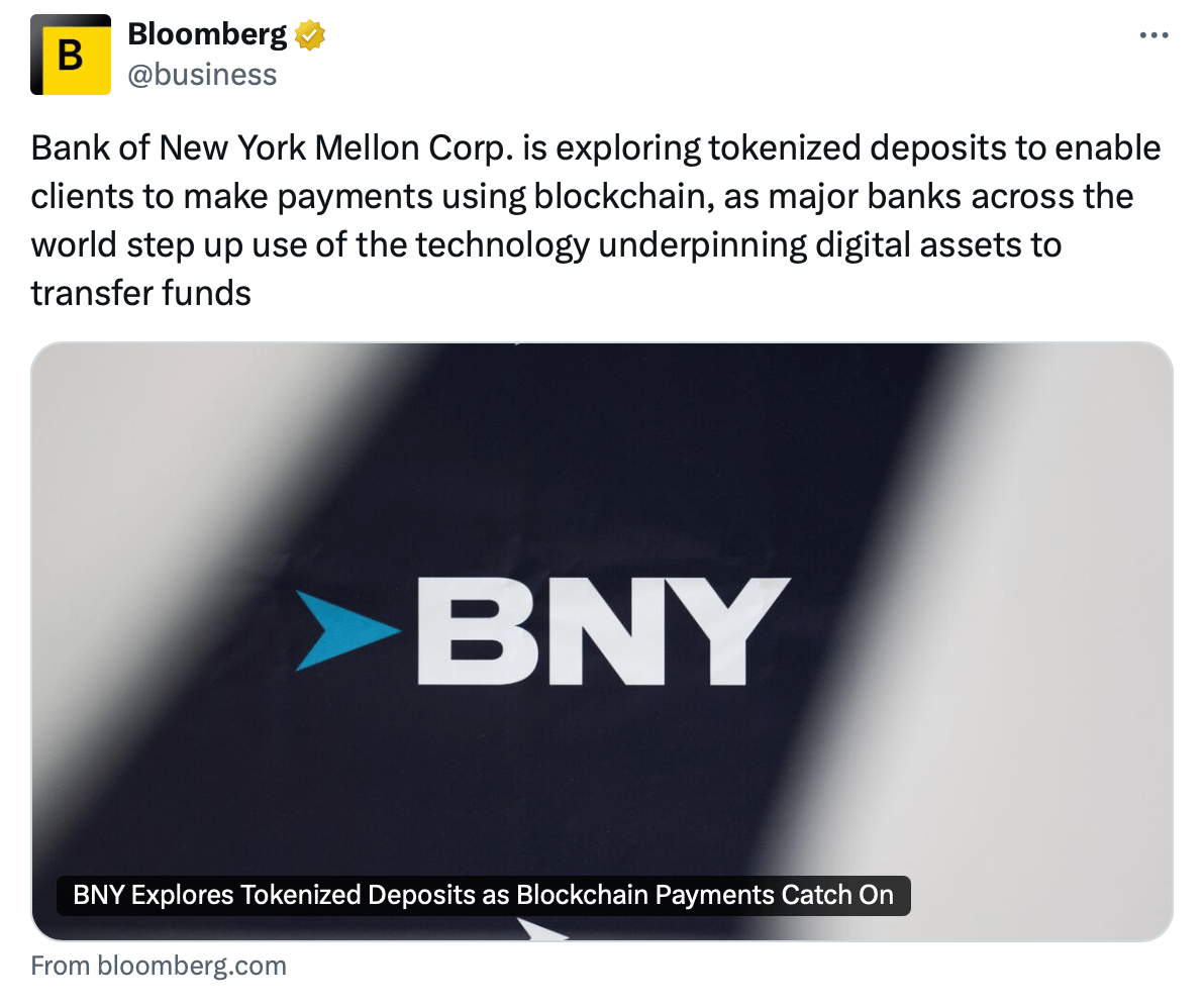 Stablecoins are everywhere right now. You can't move for banks talking about tokenized deposits. This week alone, BNY Mellon was discussing tokenized deposits. All of that's exciting because it gives you 24/7 global instant settlement potentially, although there are problems to solve. There's clearly a land grab moment happening.